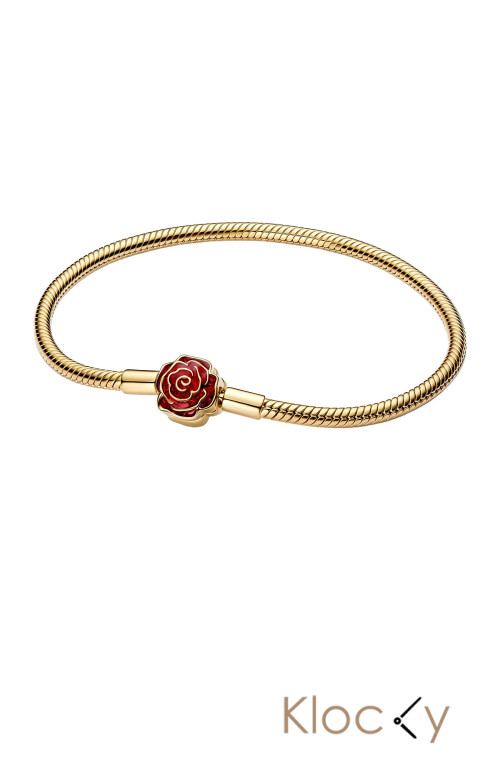 Pandora Disney Beauty & The Beast Snake Chain 14K Gold-Plated Bracelet With Rose Clasp And Holo Glittery Red Guld